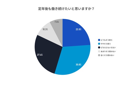 定年後の働き方は、半数以上が働き続けたいと希望しており、年代別では60代・70代のシニア層の方が、50代のミドル層より積極的に働き続けたいとの回答が約1割ほど多い結果となった。