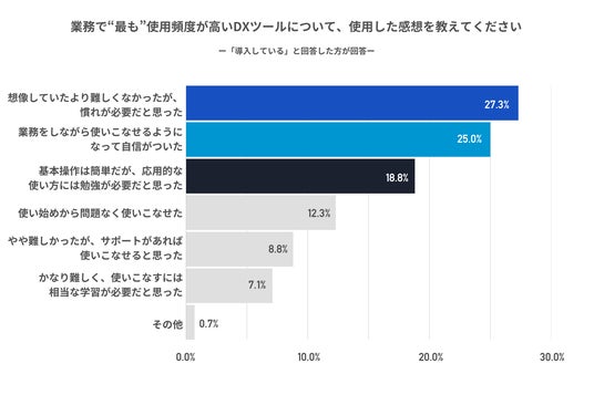 3)2)でDXのためのツールを導入していると回答した方に、業務で“最も”使用頻度が高いDXツールについて使用した感想を聞いたところ、「想像していたより難しくなかったが、慣れが必要だと思った」が27.3%、「業務をしながら使いこなせるようになって自信がついた」が25.0%、次いで「基本操作は簡単だが、応用的な使い方には勉強が必要だと思った」が18.8%となった。