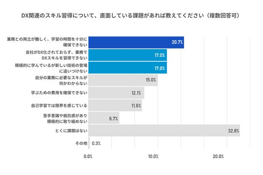 10)DX関連のスキル習得について、直面している課題があるか聞いたところ、「業務との両立が難しく、学習の時間を十分に確保できない」が20.7%、「会社がDX化されておらず、業務でDXスキルを習得できない」が17.0%となり、業務を通じてDXスキルの習得を進めることが、ミドル・シニア層のDXスキル習得にとっての重要な鍵であることがわかった。