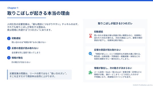 株式会社プロメディアラボ(本社:東京都中央区、代表取締役:廣瀬義憲)は、人材広告における「問い合わせ対応から商談につながらない」課題を解決するための資料『反響を“商談”に変えるインサイドセールス設計 ― 人材広告の初動と流れを整える ―』を公開しました。