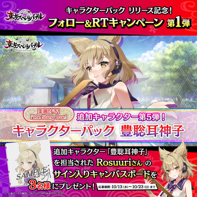 キャラクターパックのリリースを記念して、東方スペルバブル公式Twitter(@touhouSB)をフォロー&リツイートで「豊聡耳神子」のイラストを担当された、Rosuuriさんの描き下ろしイラスト&サイン入りの限定キャンバスボードを抽選で3名様にプレゼント!ぜひ奮ってご参加ください。