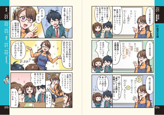 各章の最初に文法や作品の概要など、学習ポイントをマンガでレクチャー。登場キャラクターの中学生と一緒に、楽しみながら古文・漢文が学べます。