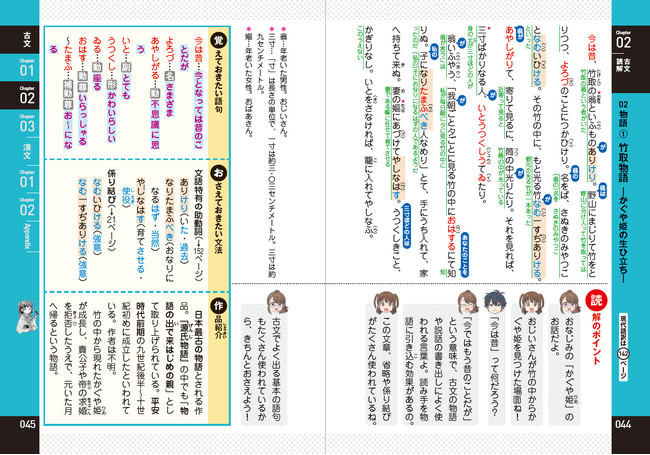 コラムには時代背景の解説や人物紹介など、作品を読むときの理解度が深まるプラスアルファの知識事項を収録。巻末付録では、取り扱った古文・漢文の現代語訳や、古文の動詞・形容詞・形容動詞の活用表、漢文の句法などをまとめています。