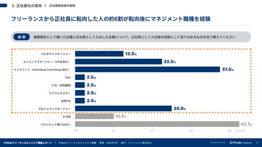 さらに、フリーランスから正社員に転向した人の約6割はマネジメント職種を経験しており、プロジェクトマネージャー(25%)、エンジニアマネージャー(22.5%)、プロダクトマネージャー(12.5%)といった職種経験が明らかに。