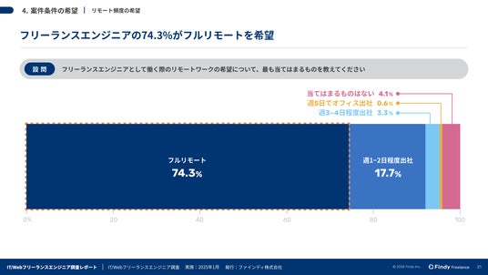 ・フリーランスエンジニアの74.3%がフルリモートを希望。背景には「通勤時間の削減・遠方在住・家庭の事情」が多数