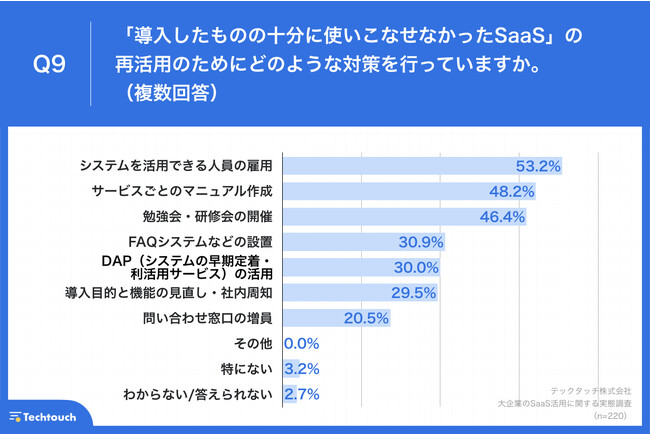 Q6で「かなりある」「ややある」と回答した方に、「Q9.「導入したものの十分に使いこなせなかったSaaS」の再活用のためにどのような対策を行っていますか。(複数回答)」(n=220)と質問したところ、「システムを活用できる人員の雇用」が53.2%、「サービスごとのマニュアル作成」が48.2%、「勉強会・研修会の開催」が46.4%という回答となりました。