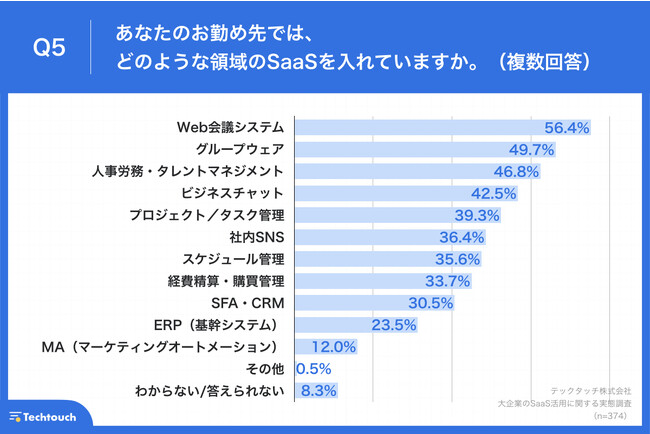 Q1で「はい」と回答した方に、「Q5.あなたのお勤め先では、どのような領域のSaaSを入れていますか。(複数回答)」(n=374)と質問したところ、「Web会議システム」が56.4%、「グループウェア」が49.7%、「人事労務・タレントマネジメント」が46.8%という回答となりました。
