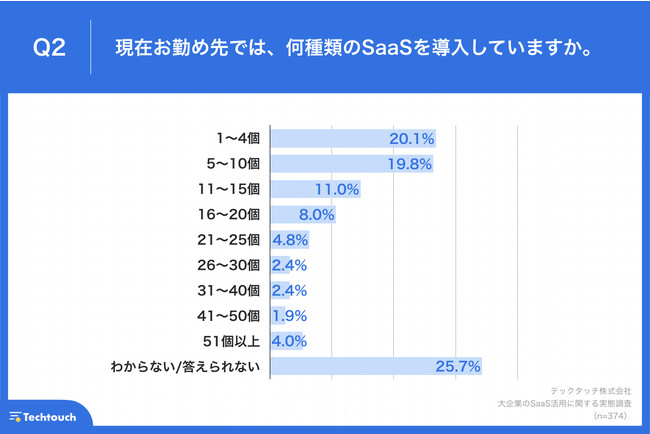 Q1で「はい」と回答した方に、「Q2.現在お勤め先では、何種類のSaaSを導入していますか。」(n=374)と質問したところ、「11~15個」が11.0%、「16~20個」が8.0%という回答となり、10個以上のSaaSを導入している企業が3割以上にのぼることがわかりました。