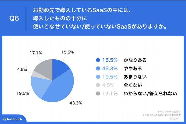 Q1で「はい」と回答した方に、「Q6.お勤め先で導入しているSaaSの中には、導入したものの十分に使いこなせていない/使っていないSaaSがありますか。」(n=374)と質問したところ、「かなりある」が15.5%、「ややある」が43.3%という回答となりました。