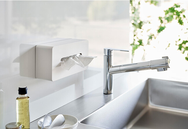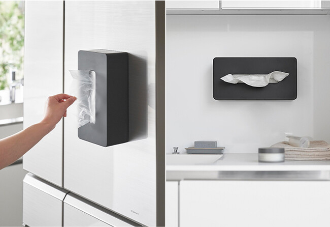 フィルムフックでお好みの位置に簡単取り付けできるティッシュケース。
