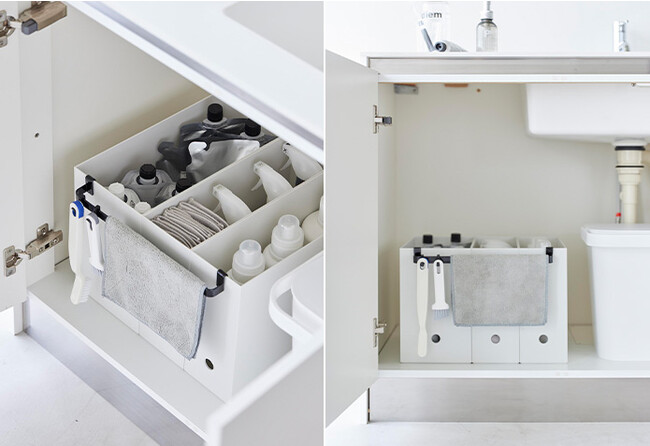 スプレーの引っ掛け収納や付属のフックで小物などの収納ができます。