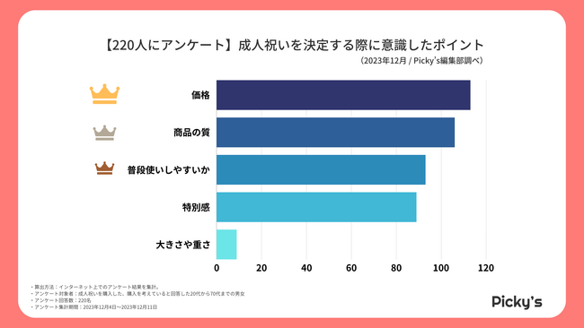 「Picky’s」は、インターネットショッピングにおいて、購入前に試せない・選ぶべきものがわからないという課題の解決を目標に、あらゆる商品のおすすめランキングや検証レビューを紹介するサイトです。このたびPicky’s(https://rentry.jp/note/)では、2024年1月8日成人の日に先駆けて、成人祝いについてインターネット上でアンケート調査を行いましたので発表いたします。