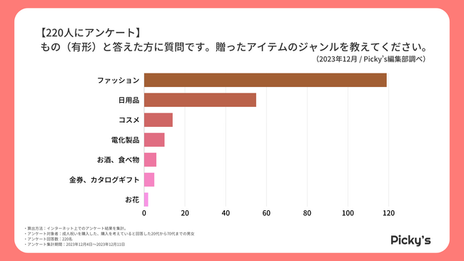 アクセサリーや腕時計、衣類、かばんなど「ファッション」のジャンルが1位になりました。身に付けるものを贈りたいと考える方が多いことが分かります。次に回答が多い2位の「日用品」では、高級なボールペンなど文房具の回答が多く、実用性が高いものを選んでいると考えられます。