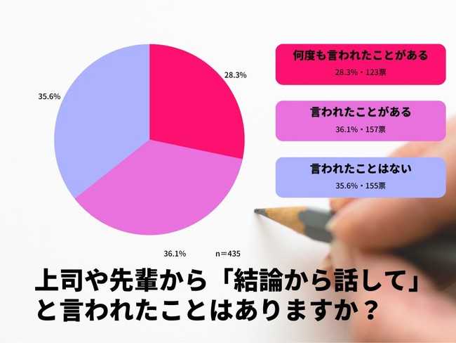 ※435名のビジネスパーソンに3択でアンケートを取りました。過半数を超える方が「何度も言われたことがある」「言われたことがある」と回答しています。この結果から多くのビジネスの現場において、上司から部下に対して「結論から話す」指導が行われていることが分かります。