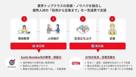 具体的には、Sushi Bomberが海外現地で展開する独自にカスタマイズした日本語教育、職業訓練、日本の文化・マナー教育を通じた実践的な人材育成と、GTNによる日本国内での住居、通信、金融、医療などの生活基盤の立ち上げ支援を密接に連携させていくことで、外国人材と企業双方にとって安心できる受入れ環境の整備を進めていきます。