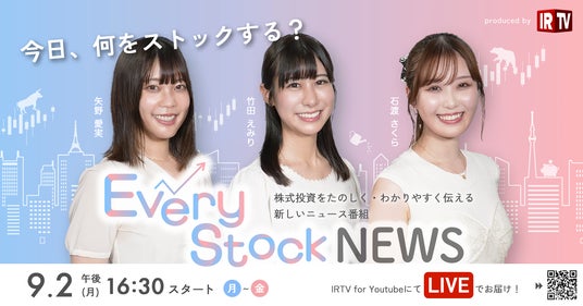 株式会社IR Roboticsが運営する “投資家と上場企業をつなぐ動画メディア”「IRTV for YouTube(アイアールティービー フォー ユーチューブ)」は、新たな試みとして視聴者参加型の株式投資ニュース番組『Every Stock NEWS(通称:エブスト)』を9月2日(月)午後16時30分より毎週月~金曜日(※祝日を除く)にて生放送することが決定いたしました。