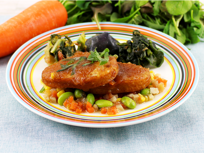 細かく刻んだ人参、さといも、とうもろこし、枝豆を敷きつめた上に、魚のすり身に豆腐を混ぜたふわふわ食感のオリジナルさつま揚げをのせました。大根おろしを混ぜ込んだ和風のあんをかけております。