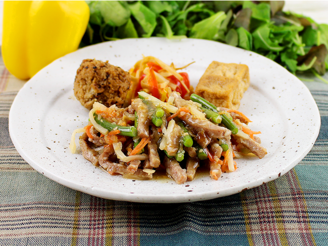 炒肉絲(チャーロースー)は中国の地方によって様々な食材を組み合わせて作られています。よく知られているものですとピーマンを使った青椒肉絲です。今回はザーサイとにんにくの芽を合わせました。細切りにしたやわらかい豚肉(成型肉)と野菜を、ザーサイの味のしみ込んだ鶏ガラ醤油味のスープで仕上げました。