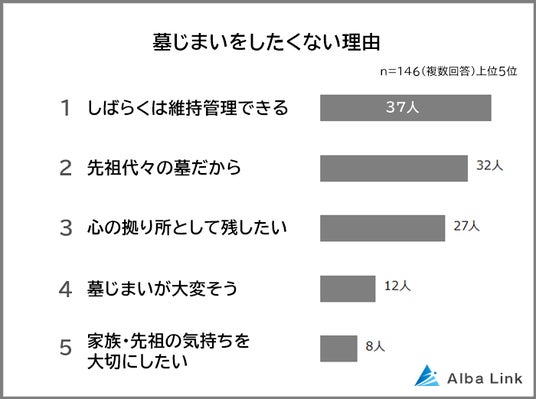 続いて「墓じまいをしたくない理由」と回答した146人にしたくない理由を聞きました。その結果、1位は「しばらくは維持管理できる(37人)」、2位は「先祖代々の墓だから(32人)」、3位は「心の拠り所として残したい(27人)」でした。