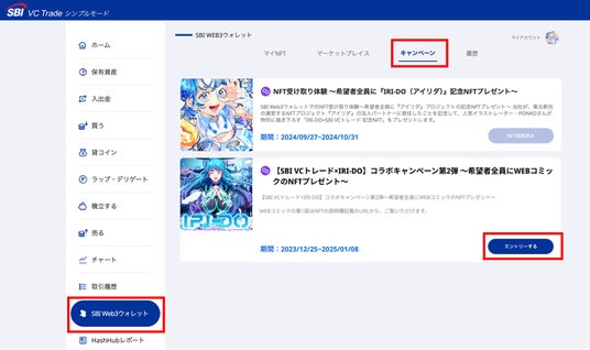 Web版の取引ツール「シンプルモード」にログインの上、メニュー「SBI Web3ウォレット」から「キャンペーン」をご選択いただき、「エントリーする」ボタンにてエントリーしてください。