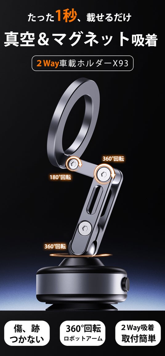 X93は、真空吸着力で車やデスクにしっかり固定できるホルダーです。 モーターの力により、わずか1秒で吸盤内が真空状態に!吸盤の凸部分が平らな表面に置かれると、自動で検知し、すぐに吸引が始まり、強力に固定されます。