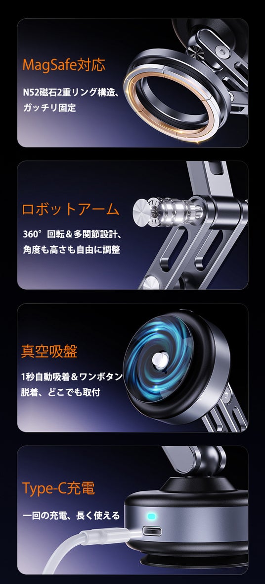 スマホリンク部分には、強力な「N52」磁石を2重リング構造で採用し、スマホやiPadにぴったりと密着。これにより、通常のマグネットよりも強力な磁力を実現し、でこぼこ道でもスマホが落ちる心配はありません。