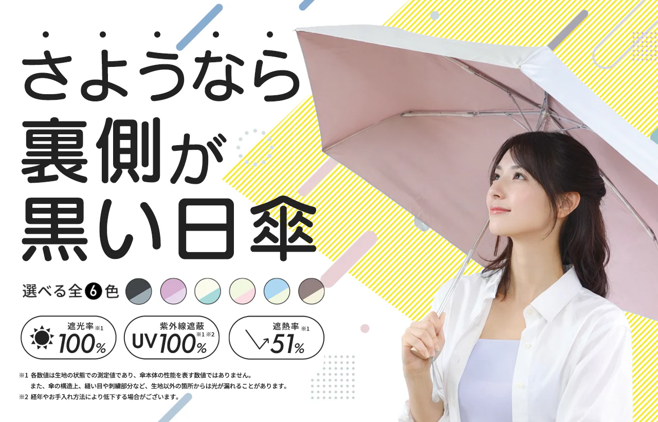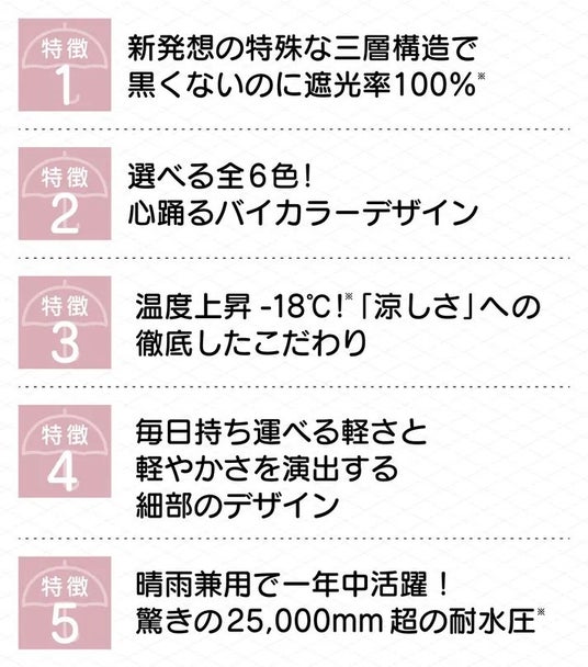 黒くないのに遮光率・UVカット率100%※、顔も明るく見えて涼しい、軽くて雨でも安心。
