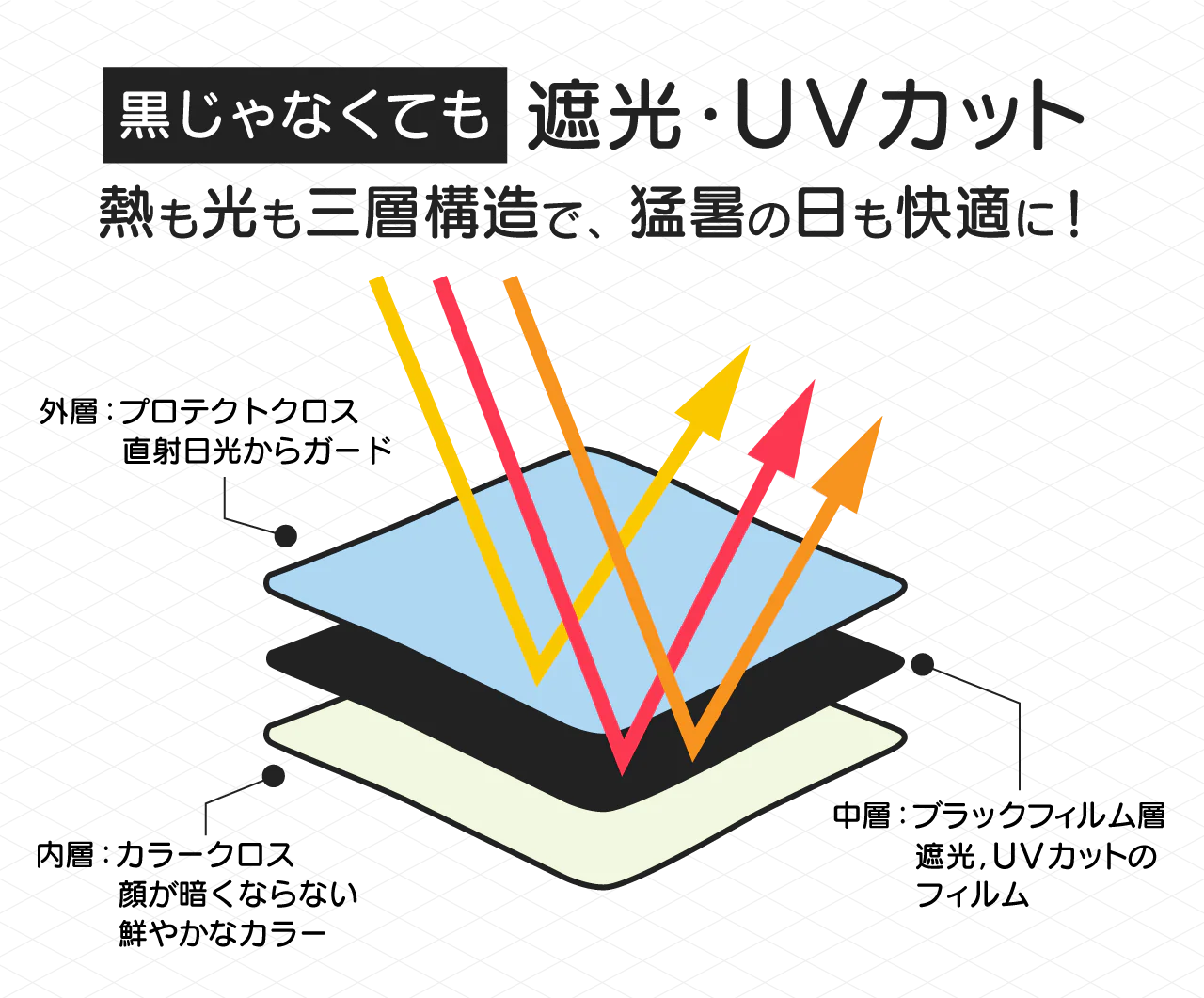 表側(プロテクトクロス)と裏側(カラークロス)の生地の間に、真っ黒な「ブラックフィルム層」をサンドイッチのように挟み込むことによって、表も裏もカラー生地ながら、遮光・UVカットを非常に高いレベルで実現しました。