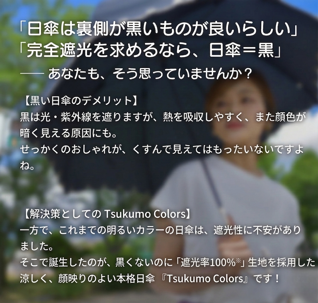 Tsukumo Colorsは、ファッションも快適さもUV対策もすべて叶える、新発想の日傘です。