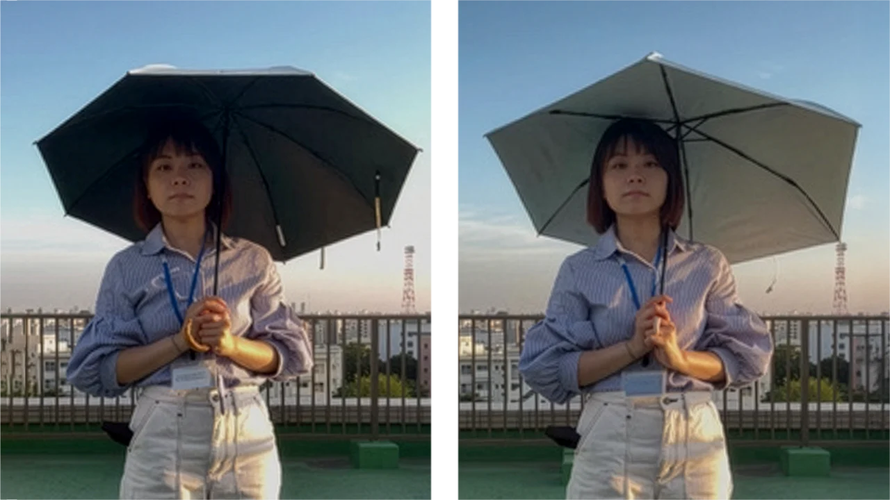 この高い遮熱性が、傘下の温度上昇を抑え、真夏の炎天下でもまるで木陰にいるような涼しさを実現しました。