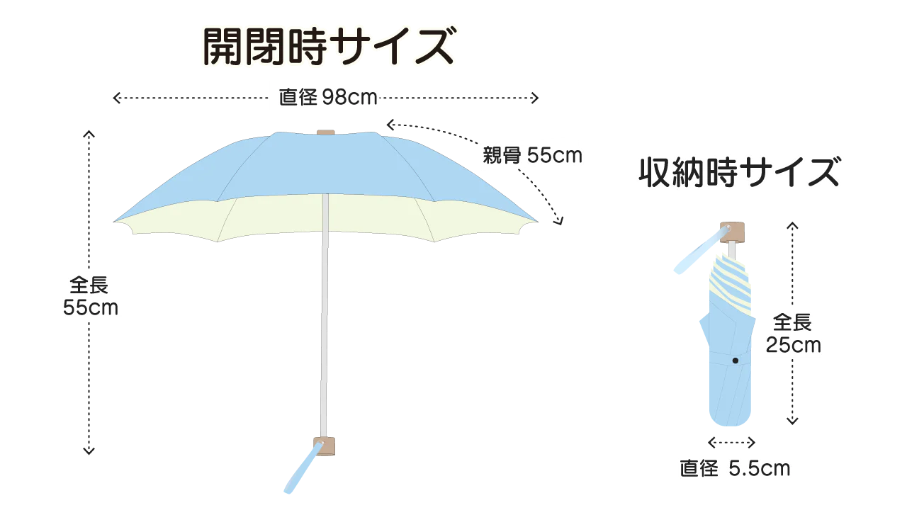 サイズ:開閉時・・・直径98cm、親骨55cm、全長55cm 収納時・・・全長25cm、直径5.5cm