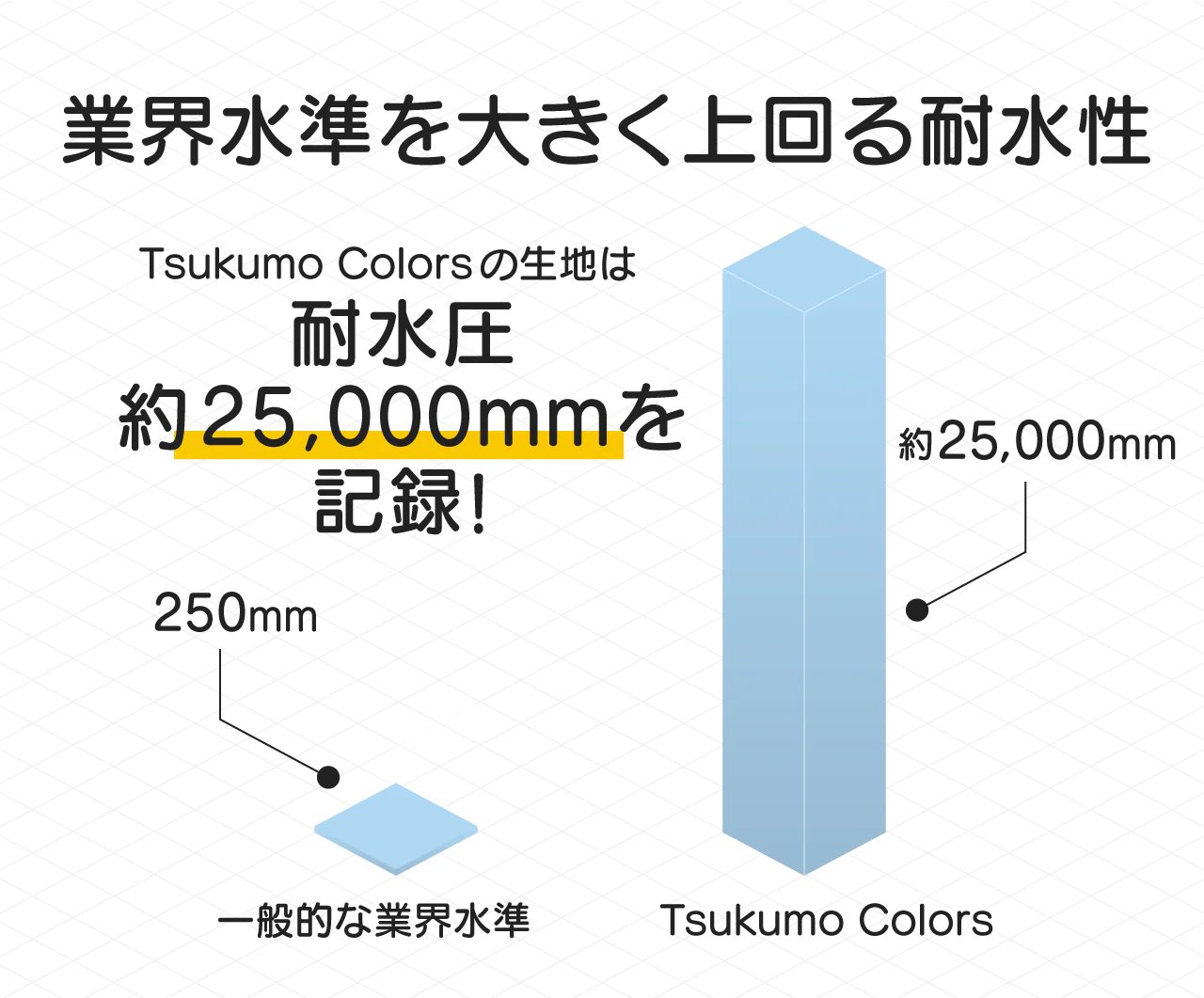 耐水圧測定試験を実施し、「最低限これくらいの耐水性が必要」という業界水準(250mm)に対して、Tsukumo Colorsはなんと約25,000mm!