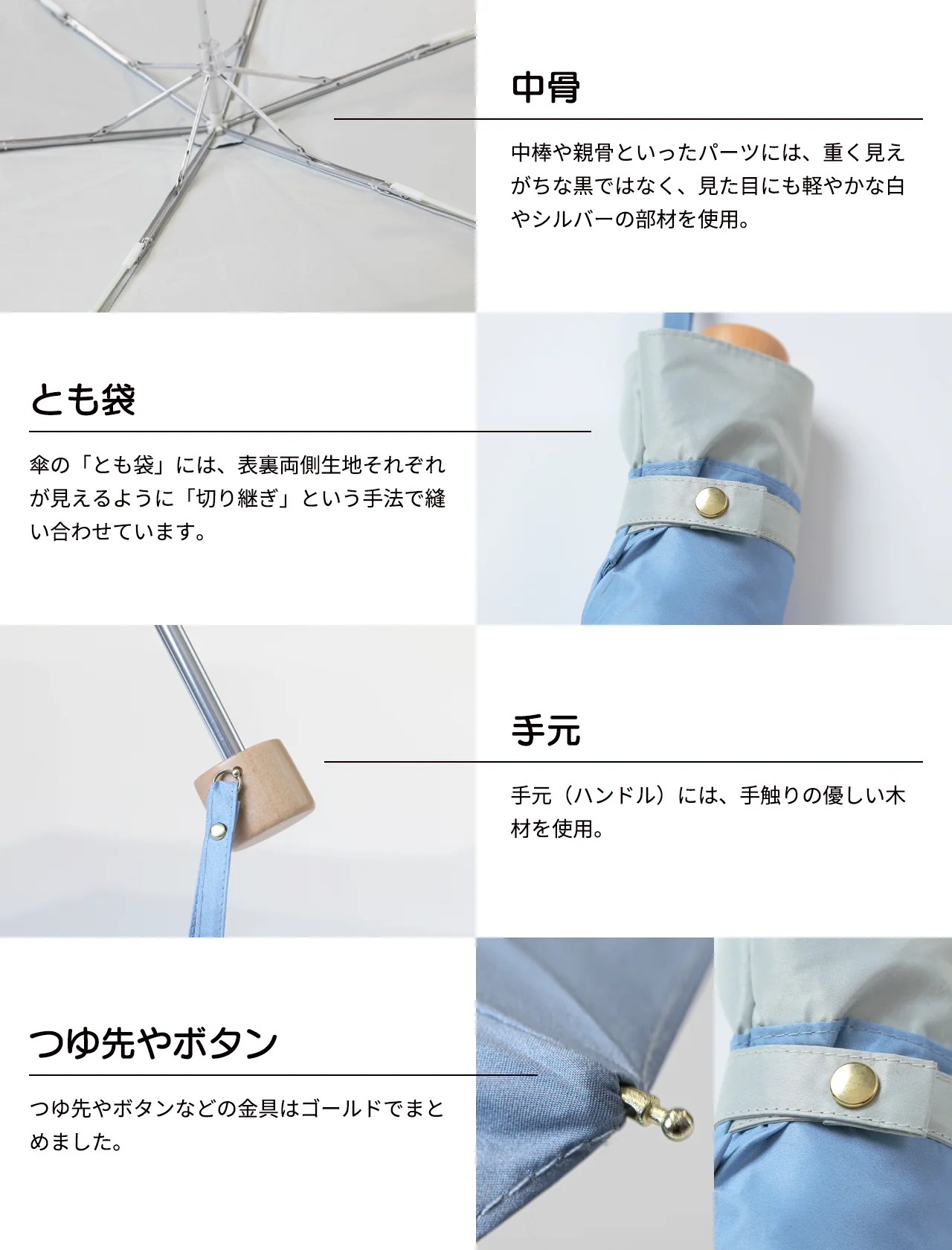 使用方法:手動開閉。使用後は陰干しして自然乾燥(洗剤・漂白剤不可)。折りたたみ可能でバッグ収納に便利。日常のお手入れは柔らかい布で拭き取り。