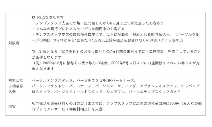 今回提供を開始する「はたらくサポートプログラム」では、そのアクションを更に強化するために、テンプスタッフ支店の預金口座で給与振込をお受け取りの派遣スタッフ等*1を対象に、みんなの銀行のプレミアムサービス利用料をキャッシュバックする取り組みを含む3つの特典を常設プログラムとしてスタートいたします。