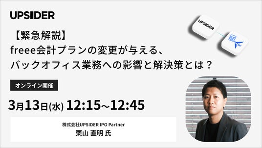 35,000社以上が利用する*サービスを提供する株式会社UPSIDER(代表取締役:宮城徹・水野智規、本社:東京都港区、以下 当社)は、「freee会計」を提供するフリー株式会社が2月26日に発表したプラン改定を受け、経理部門がサービス選定の際に求められる対応や検討のポイントなど、意思決定に必要な情報を網羅的にお話しするオンラインセミナー(以下 本イベント)を3月8日(金)・13日(水) ランチタイムに開催いたします。本イベントは、UPSIDERユーザーかどうかにかかわらず、どなたでも無料でご参加いただけます。