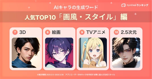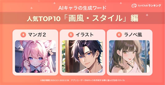 HiClub株式会社(本社:東京都港区、代表取締役社長:古谷由宇)が提供する、 AIチャット&友達作りができる対話型AIアプリ 「SynClub」(シンクラブ)(iOS、Android版)は、アプリ内でユーザーがAIキャラクターを作成する際に設定した画風・スタイルの人気ランキングを発表しました。SynClubのユーザーが生成したキャラ数を元にランキングを出し、キャラ生成数が多かったことにより、以下の画風スタイルが人気で支持されていることがわかりました。