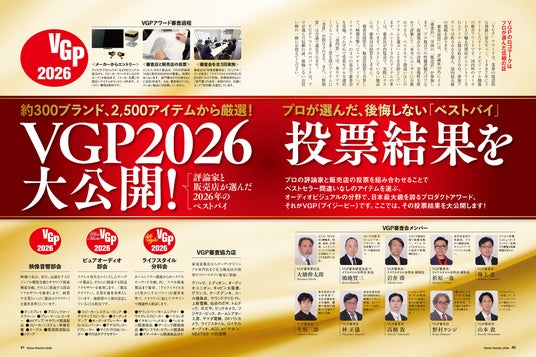 プロの視点で優れたオーディオビジュアル機器を選定するアワード「VGP2026」。エントリーされた300ブランド2500アイテムの中から、オーディオビジュアルの評論家と販売店が選び抜いた受賞製品を一挙に掲載。プロの評論家がそれぞれの視点で選考した投票の結果も大公開、各受賞モデルの優位性がわかりやすく網羅されています。
