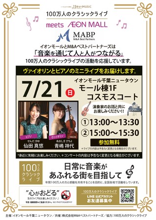 製造、建設、不動産、医療・ヘルスケア、物流、ITに特化したM&A仲介を行う株式会社M&Aベストパートナーズ(本社:東京都千代田区、代表取締役社長:齋藤 達雄 以下M&Aベストパートナーズ)と、一般財団法人100万人のクラシックライブ(東京都千代田区、代表理事:蓑田秀策 以下100万人のクラシックライブ)は、7月21日(日)13:00/15:00より、イオンモール千葉ニュータウンにて、クラシックライブを開催することをお知らせいたします。