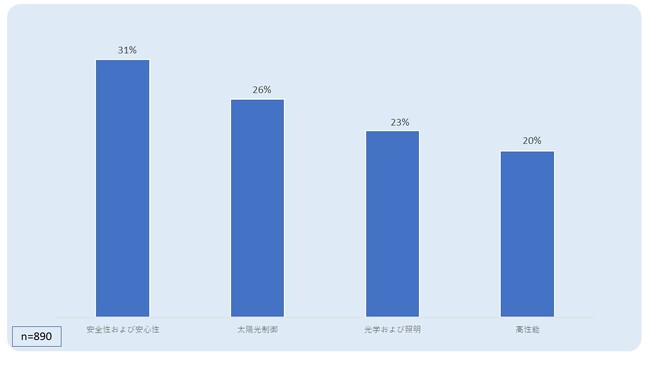 ほとんどの参加者が、「安全性と安心性」(31.1%)と回答し、次いで「太陽光制御」(26.3%)、「光学と照明」(22.5%)、「高機能」(20.1%)と続きました。