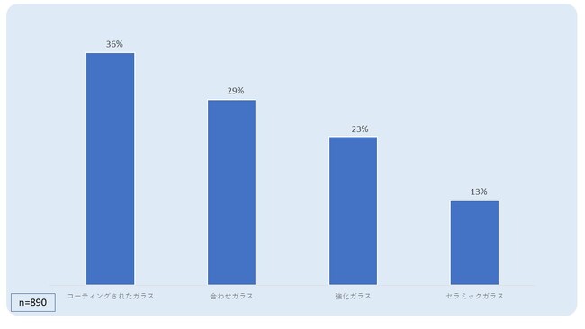 製品タイプ別では、「コーティングガラス」(35.7%)が第1位となり、「合わせガラス」(28.5%)、「強化ガラス」(22.8%)も多く選ばれています。