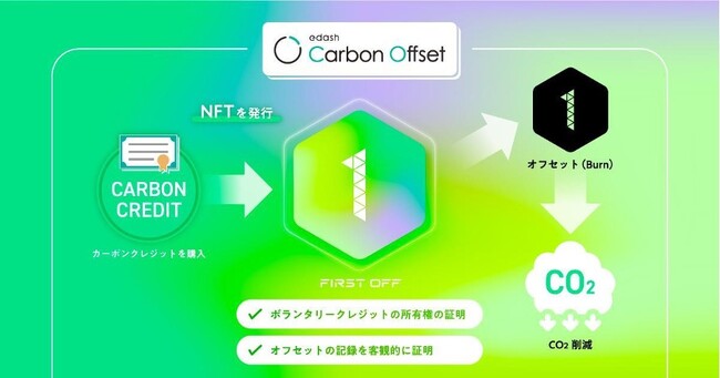 CO2排出量可視化のクラウドサービス「e-dash」を提供するe-dash株式会社(本社:東京都千代田区、代表取締役社長:山崎冬馬、読み:イーダッシュ、以下「当社」)は、「1st-Off」と名付けたトークンとしてNFT化したボランタリークレジットの販売実証を開始したことを発表します。本実証において、NFTの発行についてはブロックチェーン・スタートアップの株式会社IndieSquare(本社:東京都渋谷区、代表取締役社長:星野裕太、読み:インディースクエア、以下「IndieSquare」)と取り組み、今後カーボンクレジットをオンラインで購入できるマーケットプレイス「e-dash Carbon Offset」での本格運用を目指します。