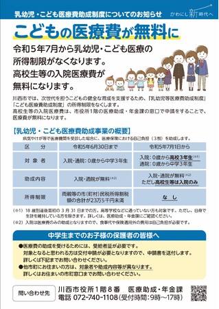 川西市では、次世代を担うこどもの健全な育成を支援するため、令和5年7月から「乳幼児等医療費助成制度」と「こども医療費助成制度」の所得制限を撤廃する。また、高校生等の入院医療費は、市役所担当課窓口で申請することで、医療費が無料になる。