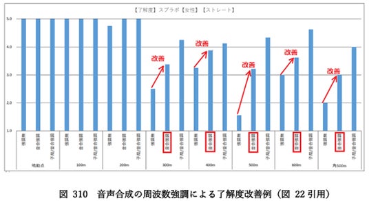 全3回に渡る実証実験の結果、操作卓側のみで周波数強調をする場合・子局でも同様の処理をする場合、いずれもスピーカーの種類を問わず広域での聞き取りやすさや音達範囲が改善することが判明しました(図2)。特に操作卓側での音声合成による周波数強調については、比較的安価かつ容易に導入できる手段として有用性が認められました。