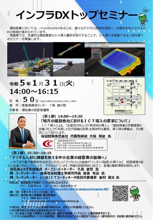 徳島県では、先進的な建設業者の「DX(デジタルトランスフォーメーション)導入事例」を紹介することで、「DX導入」を実践できる人材を育てるセミナーを「令和5年1月31日(火)」に開催します。