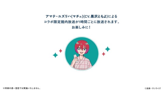 館内ではアマテ・ユズリハ(マチュ)(CV. 黒沢ともよ)によるコラボ限定館内放送が1時間ごとに放送されます。