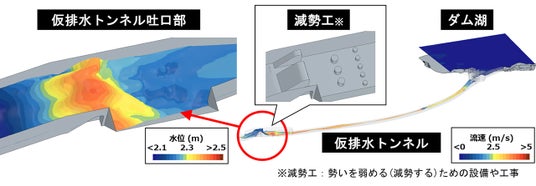仮排水トンネルは既存ダムのゲート放流によるダム施工時の被災リスクを軽減するために代替放流設備を設けて、流水をう回させるためのものです。ダム湖から下流に通じる仮排水トンネルをモデル化し、所定の水位を想定した解析を行いました。その結果、仮排水トンネル吐口(出口)部において、水の勢いを弱める減勢状況および跳ね返る流れを再現でき、仮排水トンネルの流量および放流状況の把握が可能となりました。(※10)