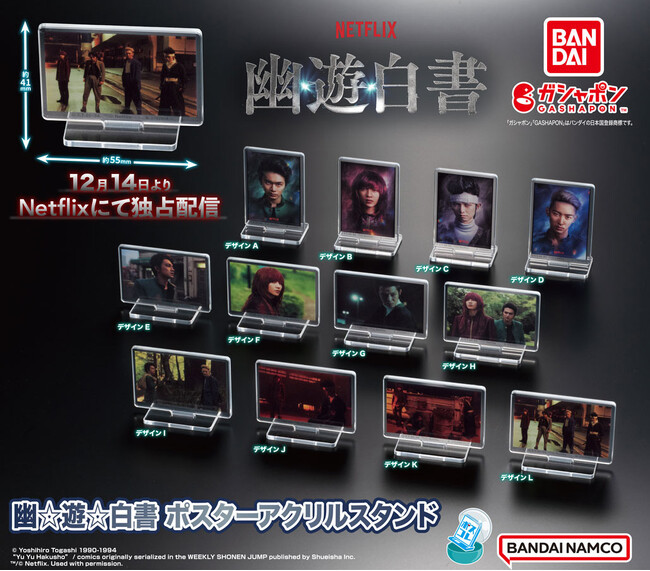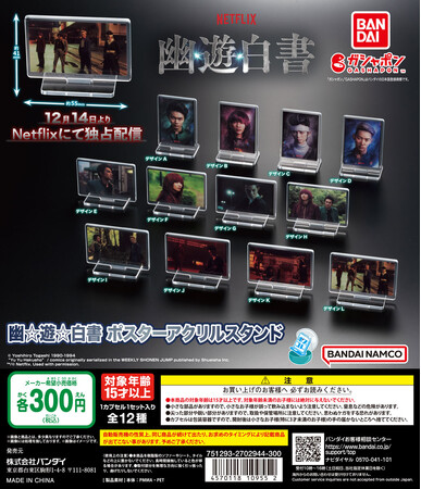 株式会社バンダイ ベンダー事業部は、週刊少年ジャンプで連載していた「幽☆遊☆白書」の世界初の実写ドラマであるNetflixシリーズ「幽☆遊☆白書」から、「Netflix 幽☆遊☆白書 ポスターアクリルスタンド」(1回300円・税10%込、全12種)を2023年12月第3週から順次、全国のガシャポンバンダイオフィシャルショップ、玩具売場、量販店、家電店などに設置されたカプセルトイ自販機にて発売いたします。