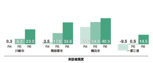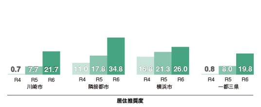 居住推奨度は、「自分が居住するまちに住むこと」をどの程度推奨するかを示す数値になります(川崎市民は川崎市について、横浜市民は横浜市について)。