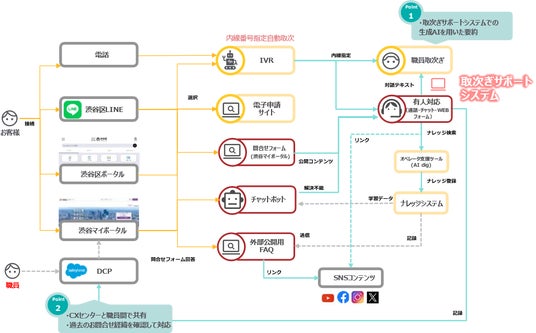 渋谷区デジタルコンタクトセンターの構築に向けた取り組みは、2024年1月から段階的に推進し、初期フェーズでは、「IVR※4の導入」「SMS送信サービス(Webページ・FAQなどデジタルコンテンツへ誘導する仕組み)の導入」「取り次ぎサポートシステム(通話内容のテキストデータ化)の導入」「KCS※5の導入」などを完了しました。これにより、住民からのコンタクトセンターへの様々な問い合わせについて、適切な所管課・デジタルコンテンツへ取り次ぎ・誘導する仕組みが整備され、また、各所管課とコンタクトセンターの連携が強化されたことで、問い合わせに対する回答情報の蓄積や問い合わせの増加が見込まれる内容の共有が活発になり、ナレッジを最大限活用することが可能になりつつあります。