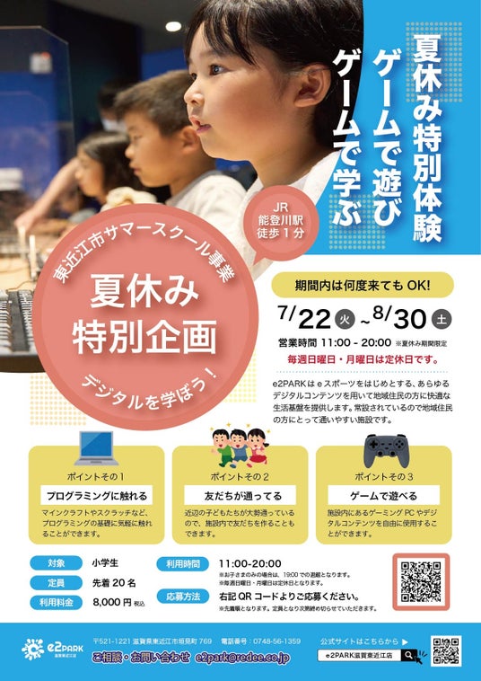 夏休み期間小学生を対象に、自宅以外にも子どもたちが自由に過ごすことができる場所を提供します。対象期間:2025年7月22日(火)~8月30日(土) (e2PARK滋賀東近江店にて)